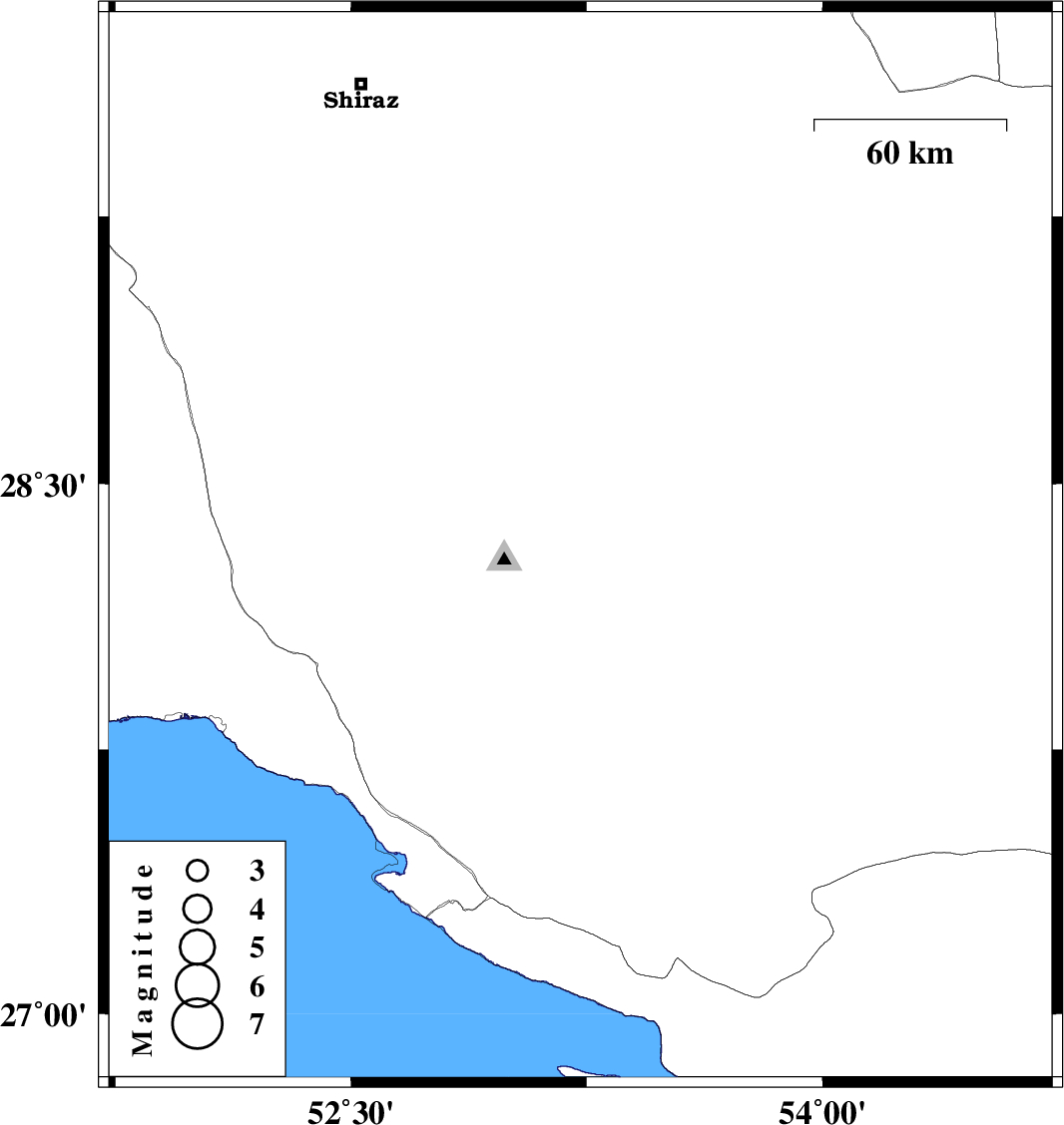 | 2008/04/28 | 17:56:43.6 | 22:26:43.6 | 28.32 | 53.23 | 35 | ML:3 | 25 km South-East of Qir va Karzin, Fars Province |