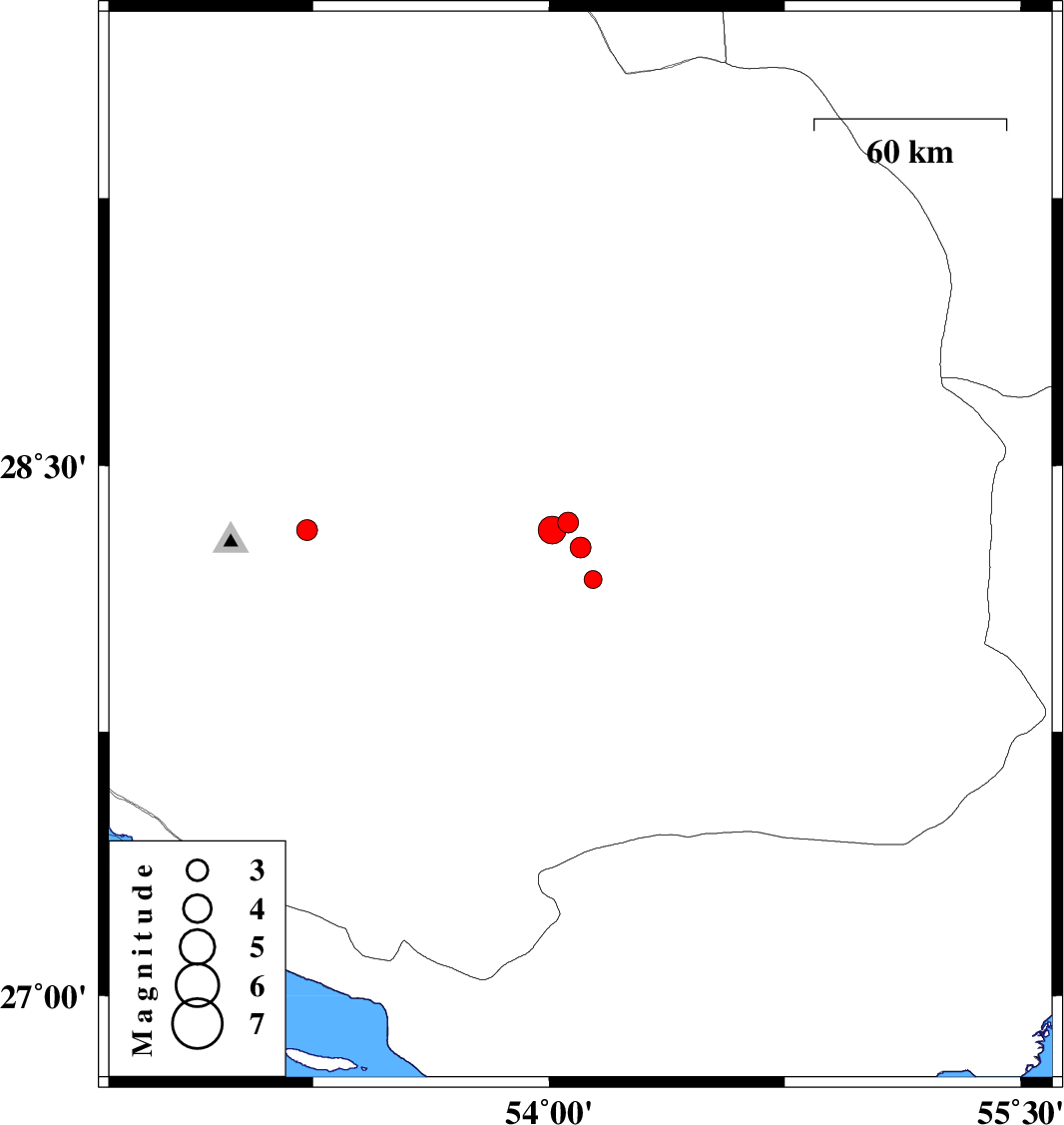 | 2008/04/29 | 06:10:43.8 | 10:40:43.8 | 28.34 | 54.06 | 41 | ML:2.9 | 52 km South-East of Jahrom, Fars Province | ||