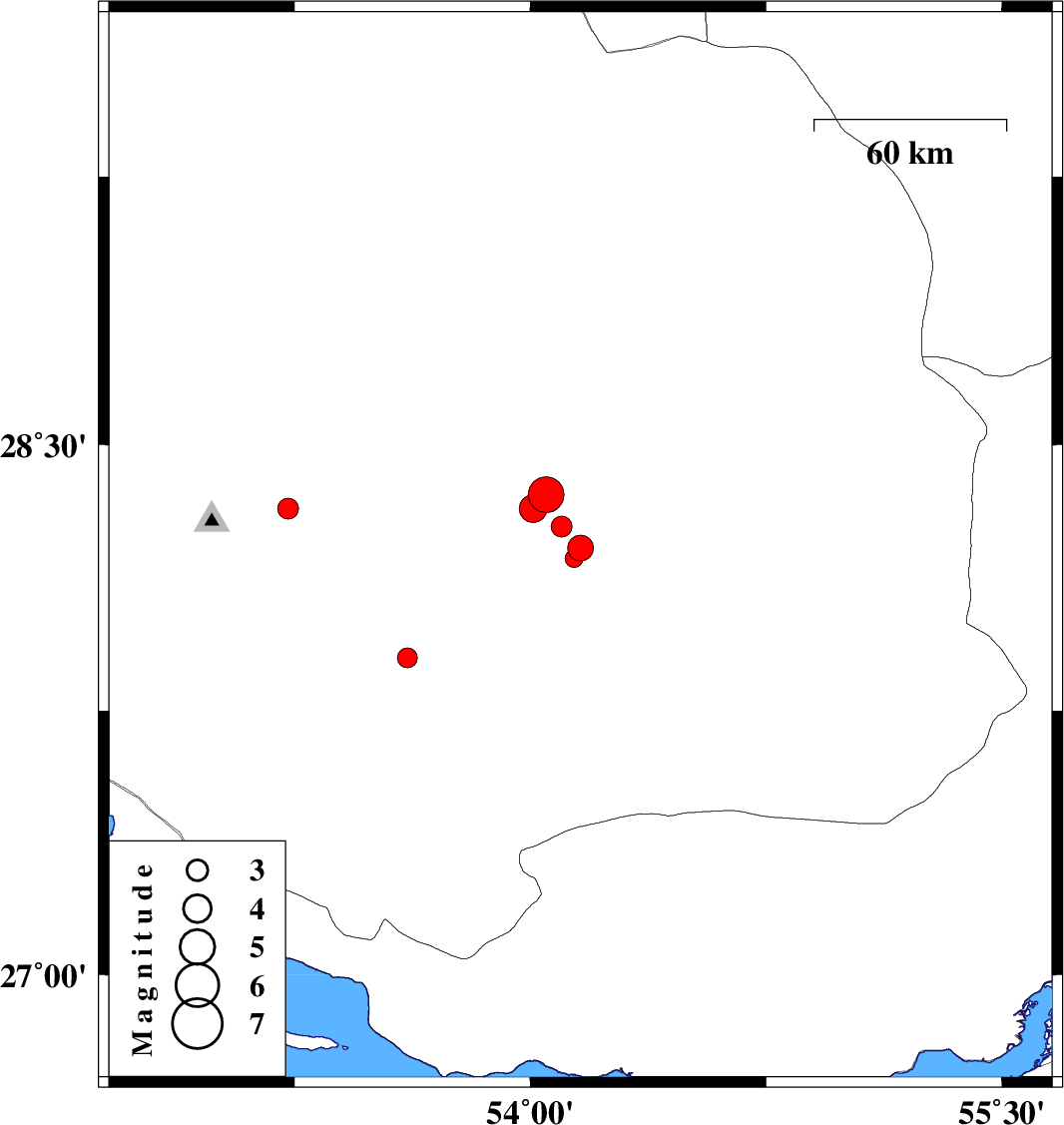 | 2008/04/29 | 06:10:43.8 | 10:40:43.8 | 28.34 | 54.06 | 41 | ML:2.9 | 52 km South-East of Jahrom, Fars Province | ||