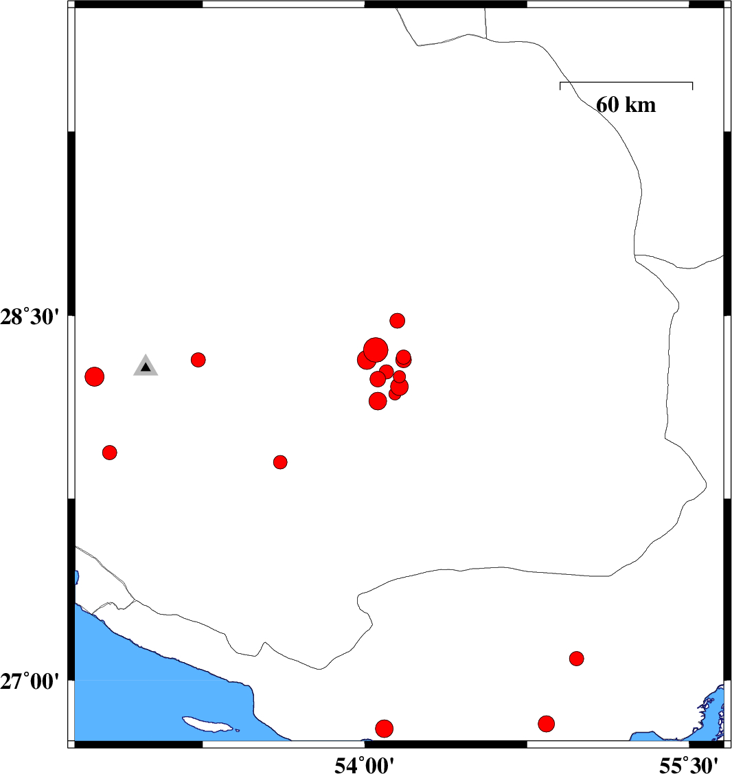 2008/04/29 | 06:10:43.8 | 10:40:43.8 | 28.34 | 54.06 | 41 | ML:2.9 | 52 km South-East of Jahrom, Fars Province | ||
