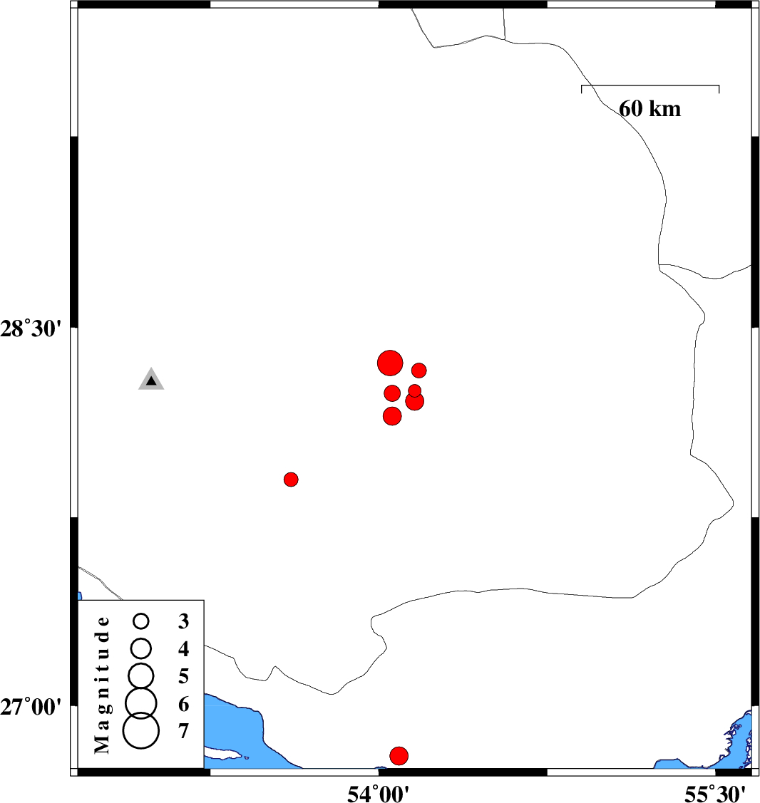 | 2008/05/07 | 12:07:28.0 | 16:37:28.0 | 26.8 | 54.09 | 34 | ML:3.7 | 52 km South-West of Bastak, Hormozgan Province | ||