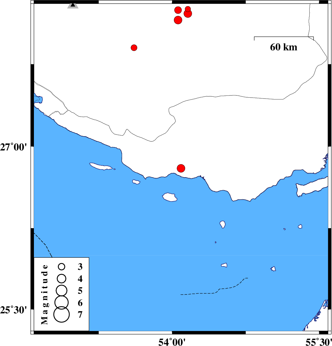 | 2008/05/05 | 08:00:35.3 | 12:30:35.3 | 27.9 | 53.61 | 31 | ML:2.8 | 67 km South of Jahrom, Fars Province |