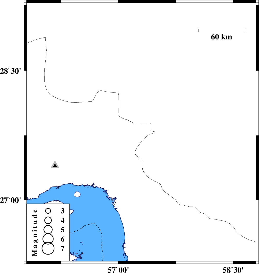 | 2008/05/18 | 23:09:15.3 | 03:39:15.3 | 27.78 | 57.3 | 31 | ML:3.3 | 39 km North of Dehbarez, Hormozgan Province |