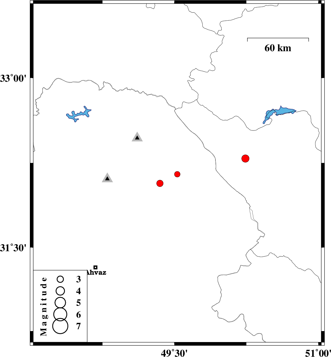 | 2008/05/15 | 04:28:56.8 | 08:58:56.8 | 32.07 | 49.35 | 36 | ML:3.1 | 16 km North of Masjed Soleyman, Khoozestan Province |