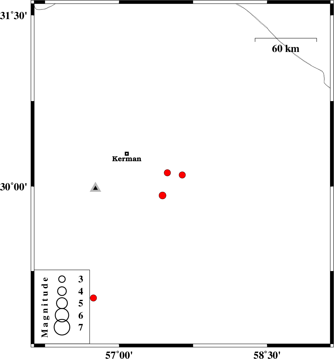 | 2008/05/21 | 00:59:49.9 | 05:29:49.9 | 30.1 | 57.64 | 14 | ML:3 | 57 km South-East of Kerman, Kerman Province | ||