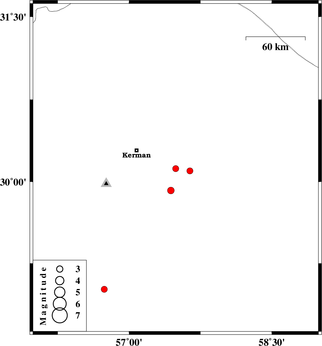 | 2008/05/21 | 00:59:49.9 | 05:29:49.9 | 30.1 | 57.64 | 14 | ML:3 | 57 km South-East of Kerman, Kerman Province | ||