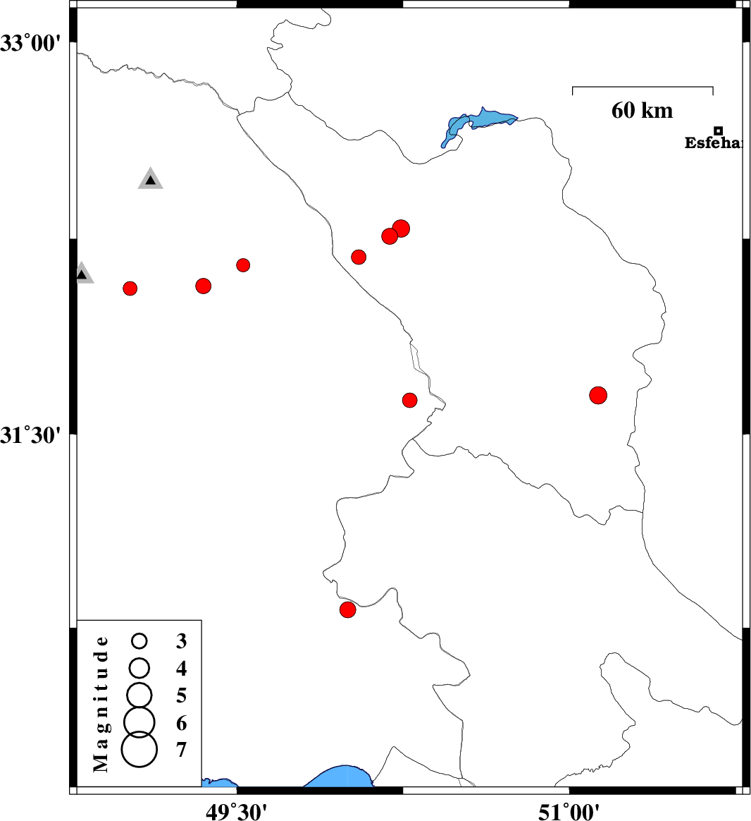 | 2008/05/19 | 16:52:44.5 | 21:22:44.5 | 32.29 | 50.24 | 17 | ML:3.5 | 22 km South-East of Chelgard, Chaharmahal Bakhtiari Province | ||