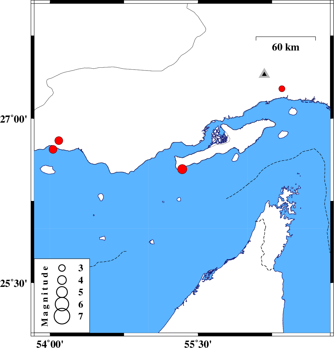 | 2008/05/11 | 02:48:24.2 | 07:18:24.2 | 26.72 | 54.03 | 14 | ML:3.6 | Persian Gulf, 62 km South-West of Bastak | ||