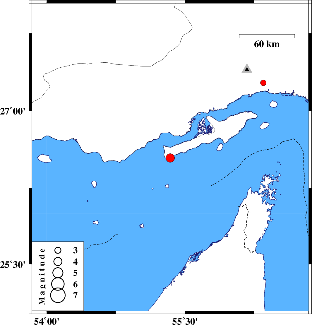 | 2008/05/31 | 01:24:03.5 | 05:54:03.5 | 26.54 | 55.34 | 16 | ML:4.3 | Persian Gulf, 48 km East of Bandar-e lengeh | ||