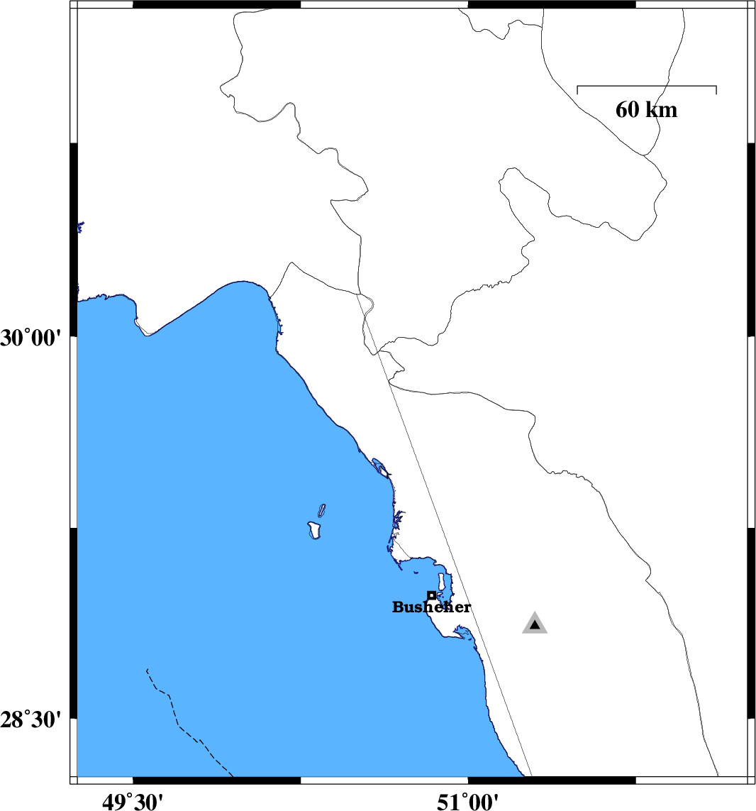 | 2008/06/01 | 05:05:56.4 | 09:35:56.4 | 29.77 | 50.75 | 12 | ML:3.5 | 31 km North-East of Bandar-e genaveh, Bushehr Province | ||