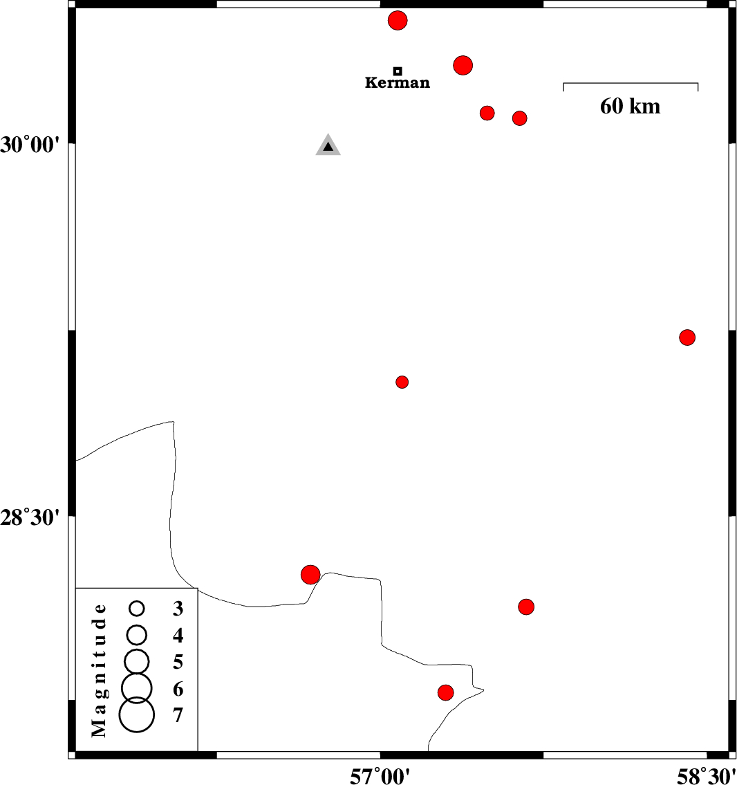 | 2008/05/08 | 14:24:31.8 | 18:54:31.8 | 28.13 | 57.67 | 15 | ML:3.3 | 19 km North of Kahnuj, Kerman Province |