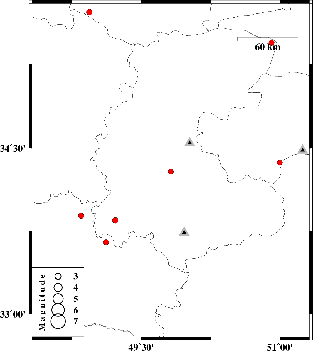 | 2008/05/21 | 20:15:40.1 | 00:45:40.1 | 33.89 | 48.85 | 15 | ML:2.7 | 8 km Borujerd, Lorestan Province |
