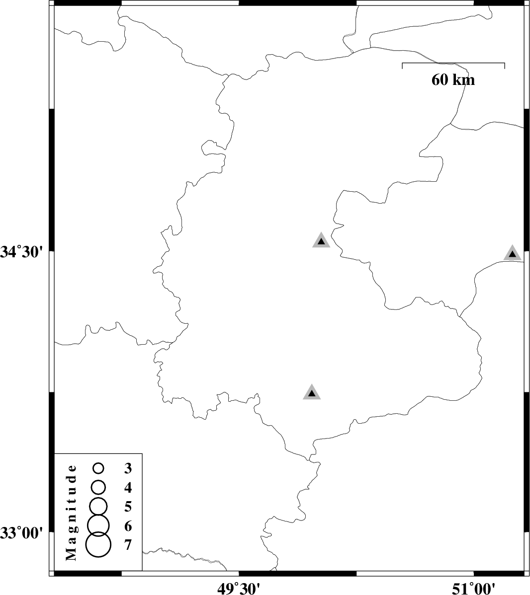 | 2008/06/15 | 05:43:42.5 | 10:13:42.5 | 34.29 | 49.82 | 14 | ML:2.6 | 26 km North-East of Arak, Markazi Province |
