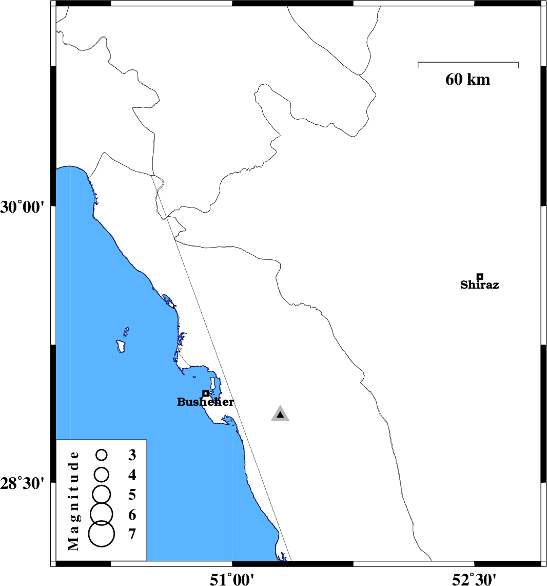 | 2008/06/15 | 08:50:17.8 | 13:20:17.8 | 29.57 | 51.41 | 15 | ML:3.2 | 24 km West of Kazerun, Fars Province |