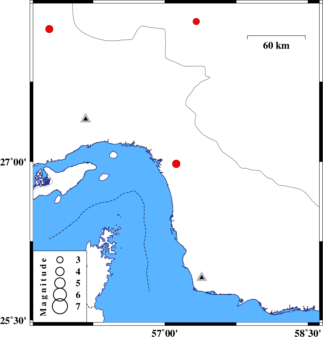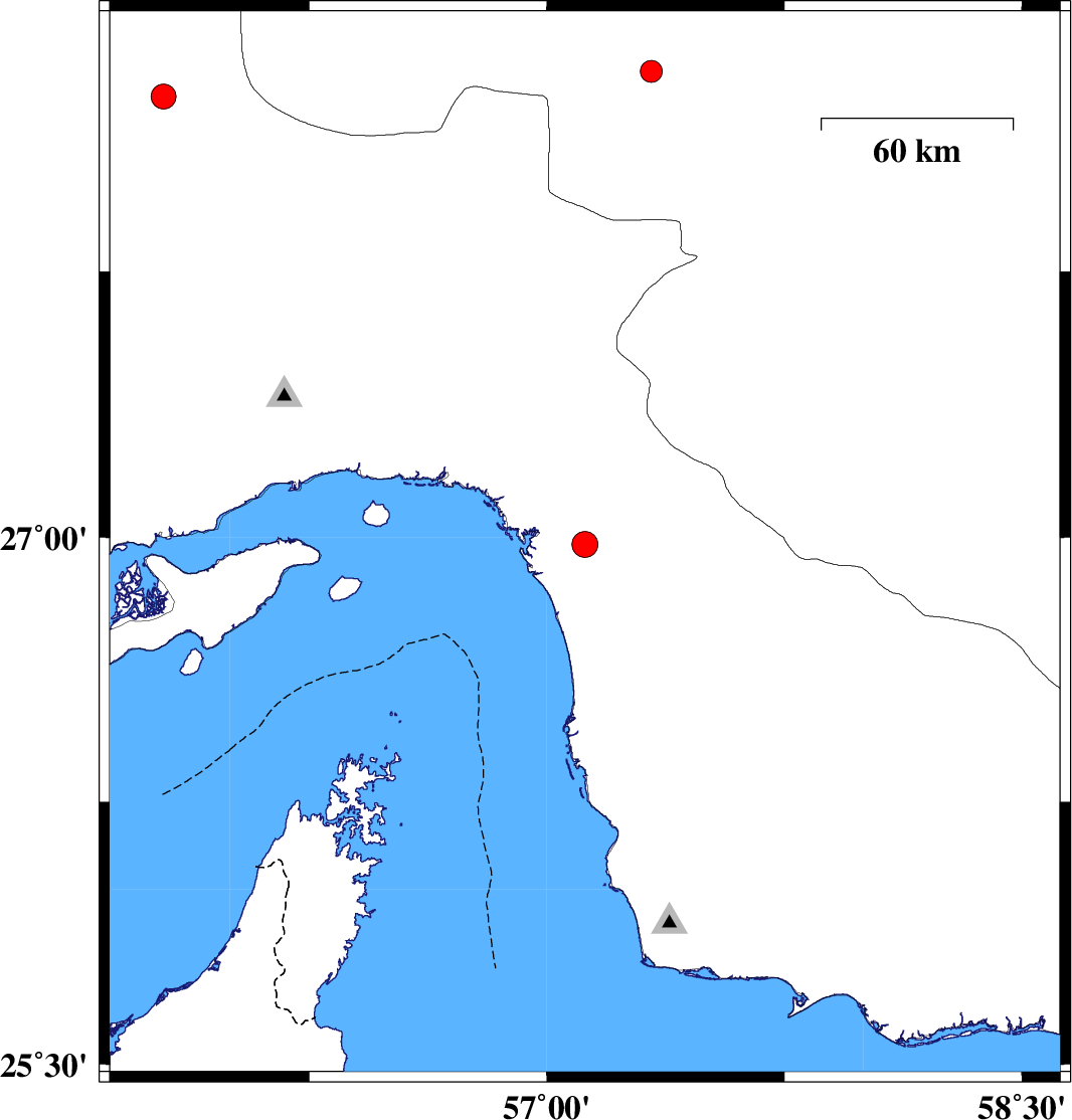 | 2008/06/17 | 16:53:29.4 | 21:23:29.4 | 26.98 | 57.12 | 17 | ML:3.7 | 19 km South of Minab, Hormozgan Province | ||