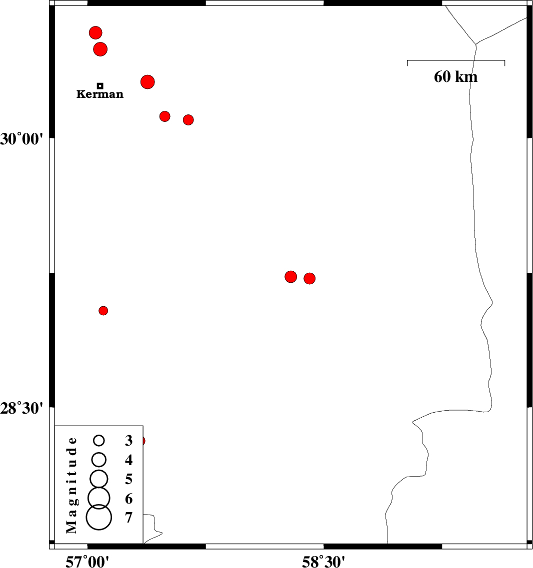 | 2008/05/21 | 00:59:49.9 | 05:29:49.9 | 30.1 | 57.64 | 14 | ML:3 | 57 km South-East of Kerman, Kerman Province |