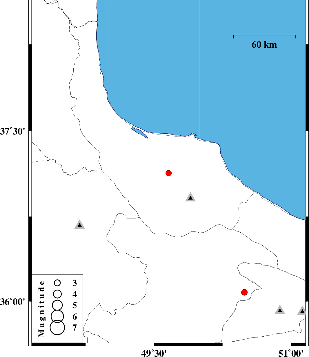 | 2008/06/19 | 11:47:03.2 | 16:17:03.2 | 37.13 | 49.66 | 23 | ML:2.8 | 17 km South of Rasht, Gilan Province | ||