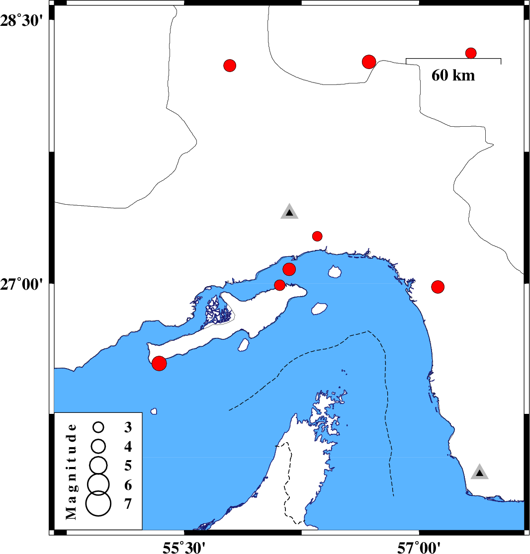| 2008/06/06 | 22:44:35.7 | 03:14:35.7 | 26.99 | 56.11 | 12 | ML:3.1 | Persian Gulf, 15 km West of Qeshm | ||