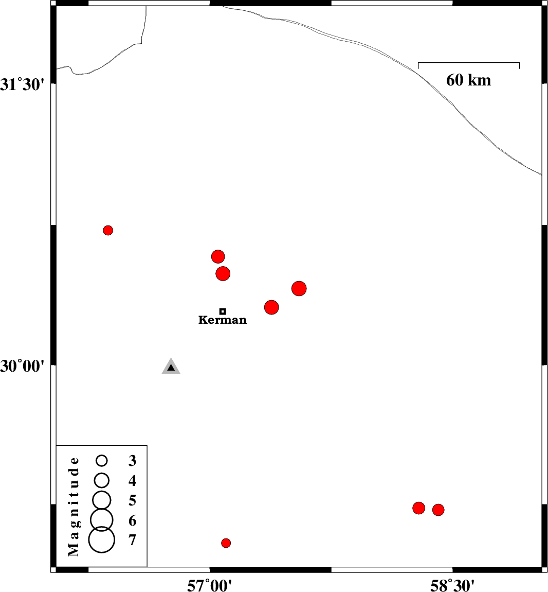 | 2008/06/05 | 08:39:56.2 | 13:09:56.2 | 30.58 | 57.05 | 14 | ML:3.6 | 32 km North of Kerman, Kerman Province | ||
