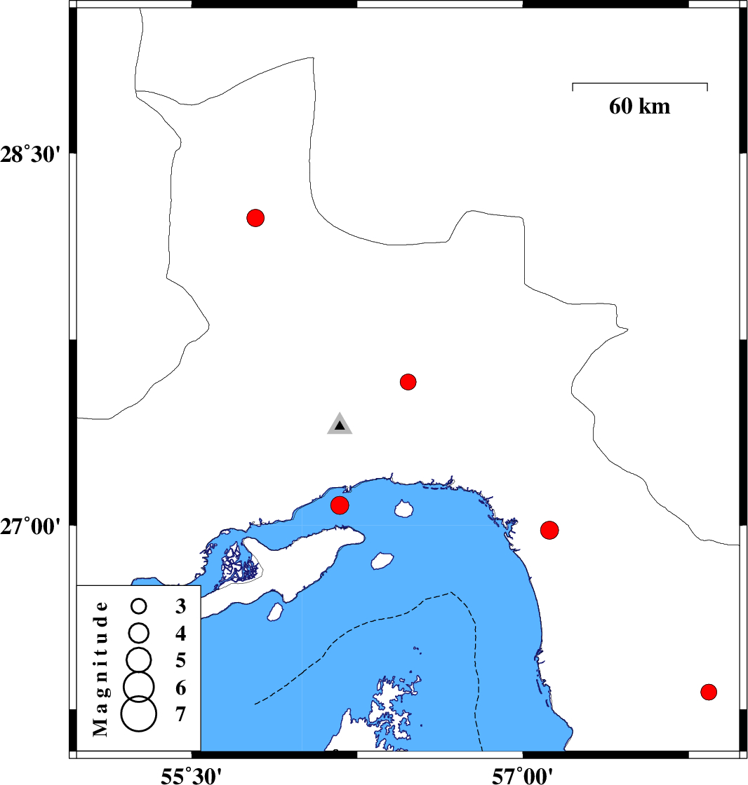 | 2008/06/23 | 22:16:14.6 | 02:46:14.6 | 27.58 | 56.48 | 14 | ML:3.3 | 48 km North-East of Bandar-e abbas, Hormozgan Province | ||