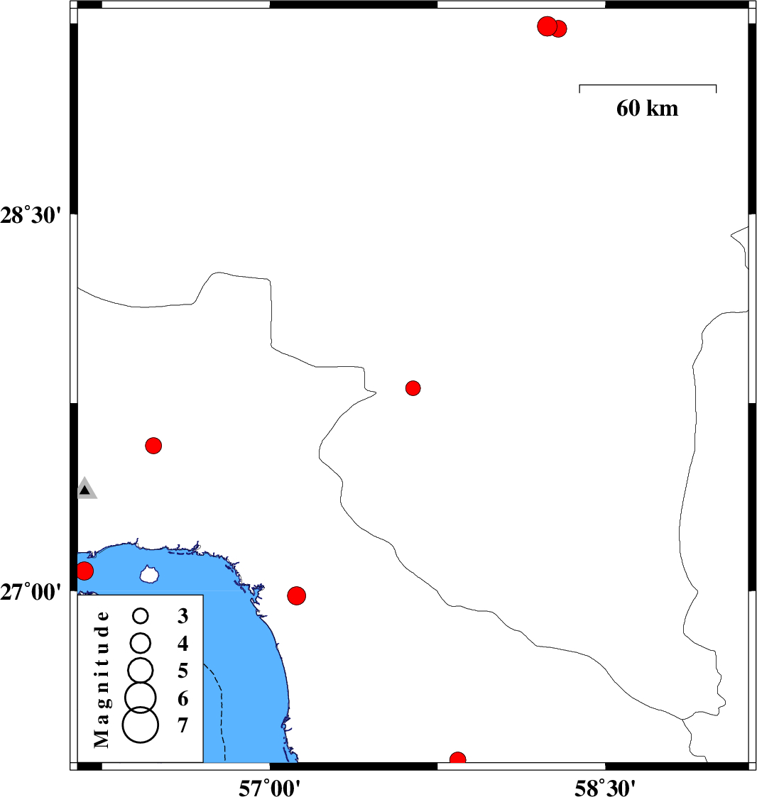 | 2008/06/23 | 22:16:14.6 | 02:46:14.6 | 27.58 | 56.48 | 14 | ML:3.3 | 48 km North-East of Bandar-e abbas, Hormozgan Province | ||