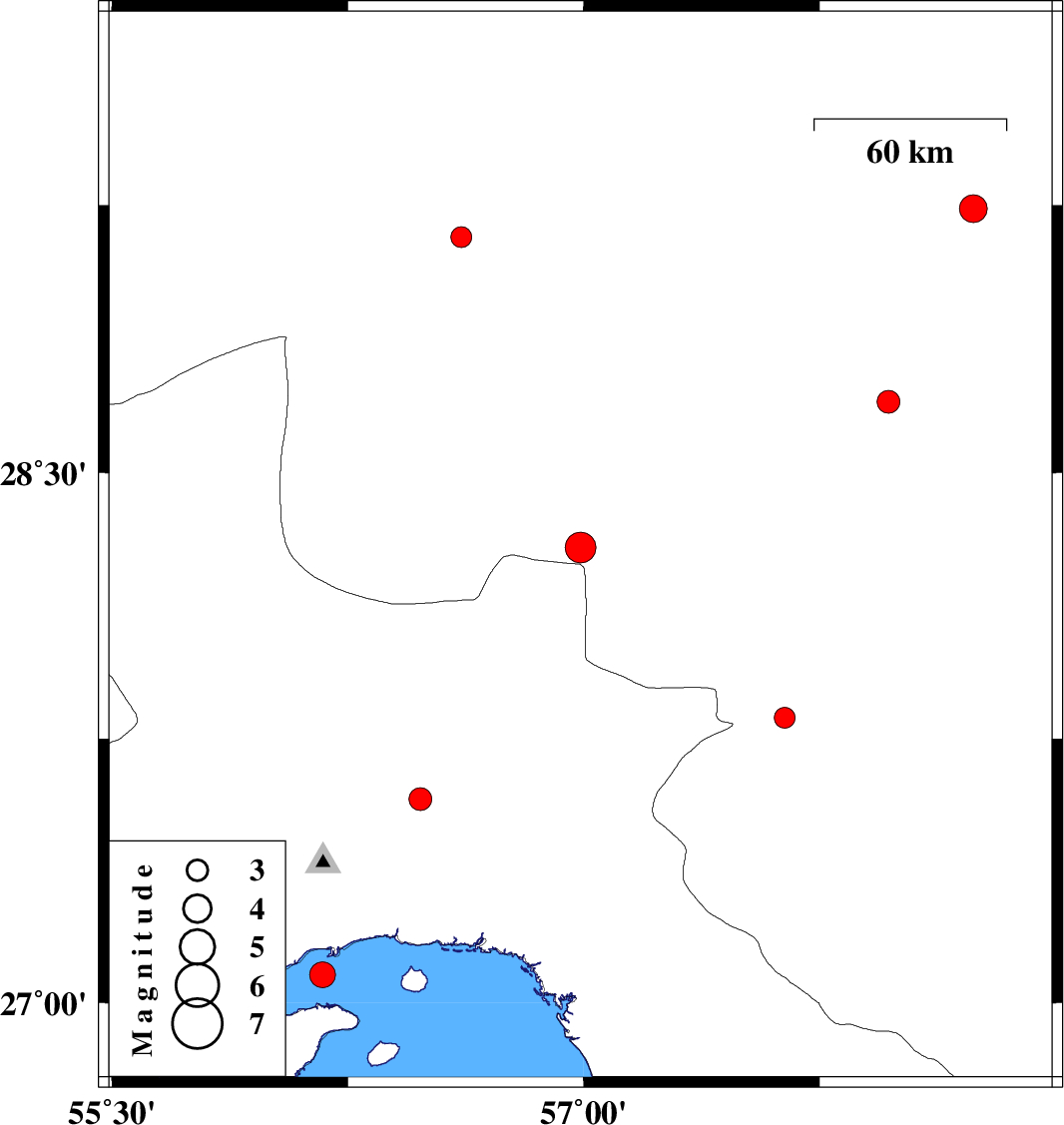 | 2008/06/23 | 22:16:14.6 | 02:46:14.6 | 27.58 | 56.48 | 14 | ML:3.3 | 48 km North-East of Bandar-e abbas, Hormozgan Province | ||