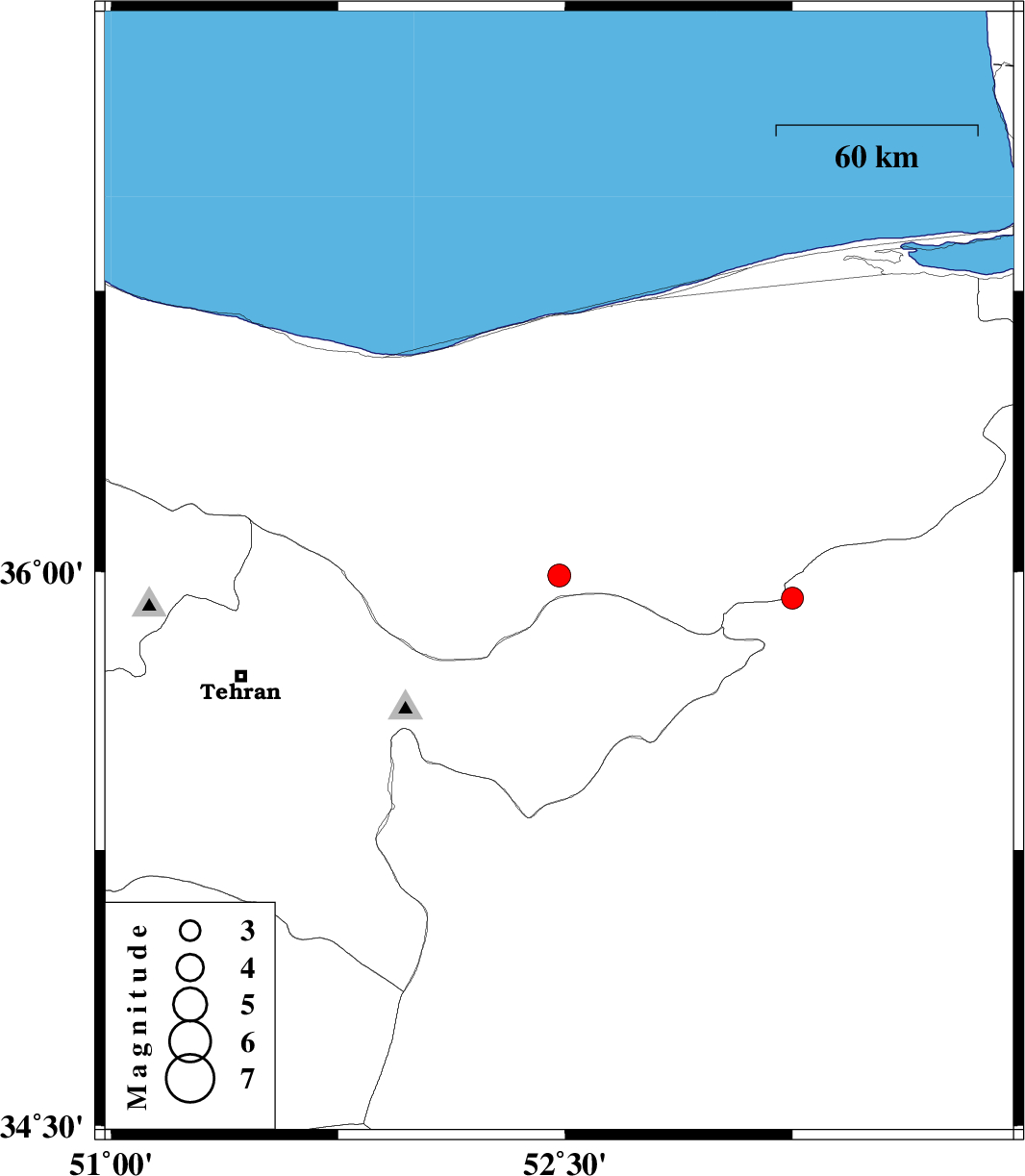 | 2008/06/29 | 00:38:27.1 | 05:08:27.1 | 35.99 | 52.48 | 14 | ML:3.4 | 37 km North-West of Firuzkuh, Tehran Province | ||