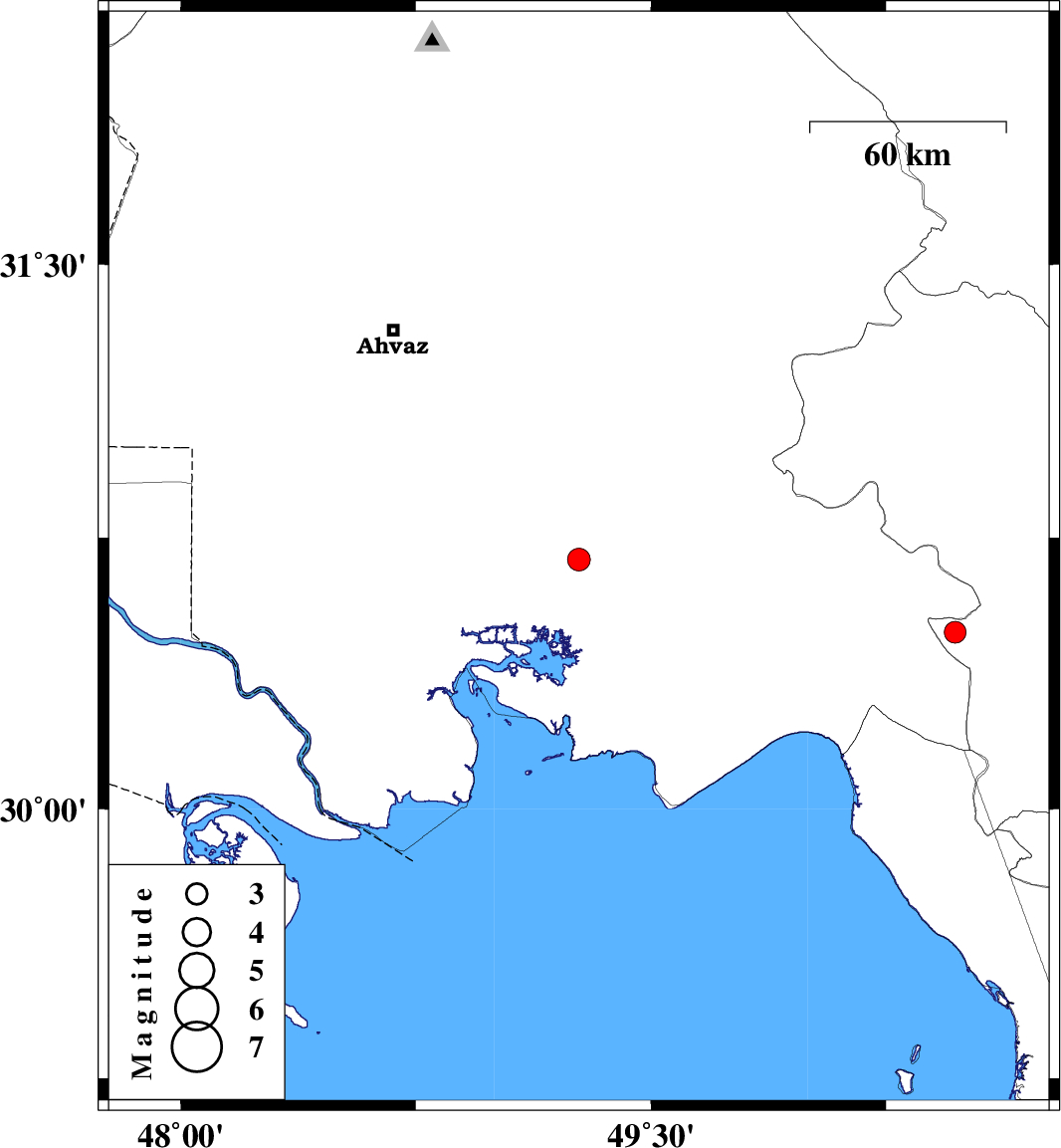 | 2008/06/29 | 13:11:07.5 | 17:41:07.5 | 30.69 | 49.27 | 14 | ML:3.2 | 16 km North of Bandar-e mahshahr, Khoozestan Province | ||