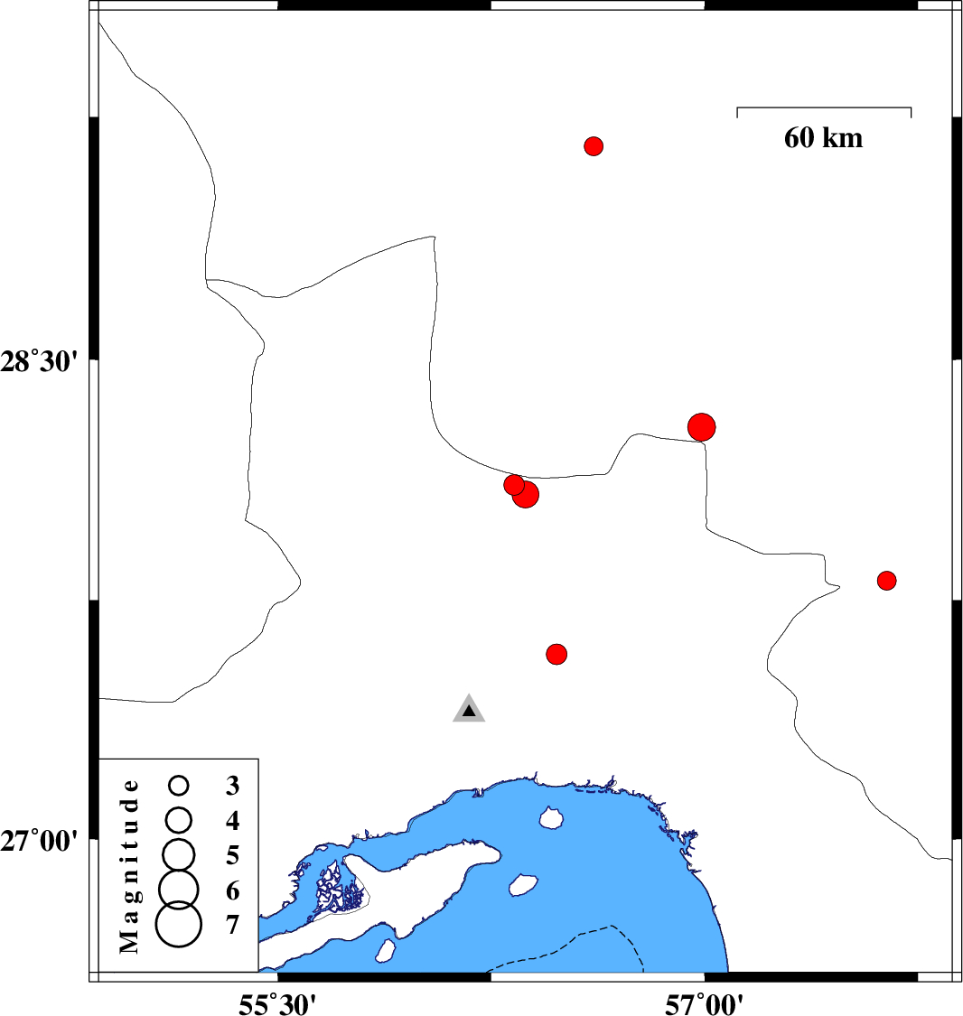 | 2008/06/23 | 22:16:14.6 | 02:46:14.6 | 27.58 | 56.48 | 14 | ML:3.3 | 48 km North-East of Bandar-e abbas, Hormozgan Province |