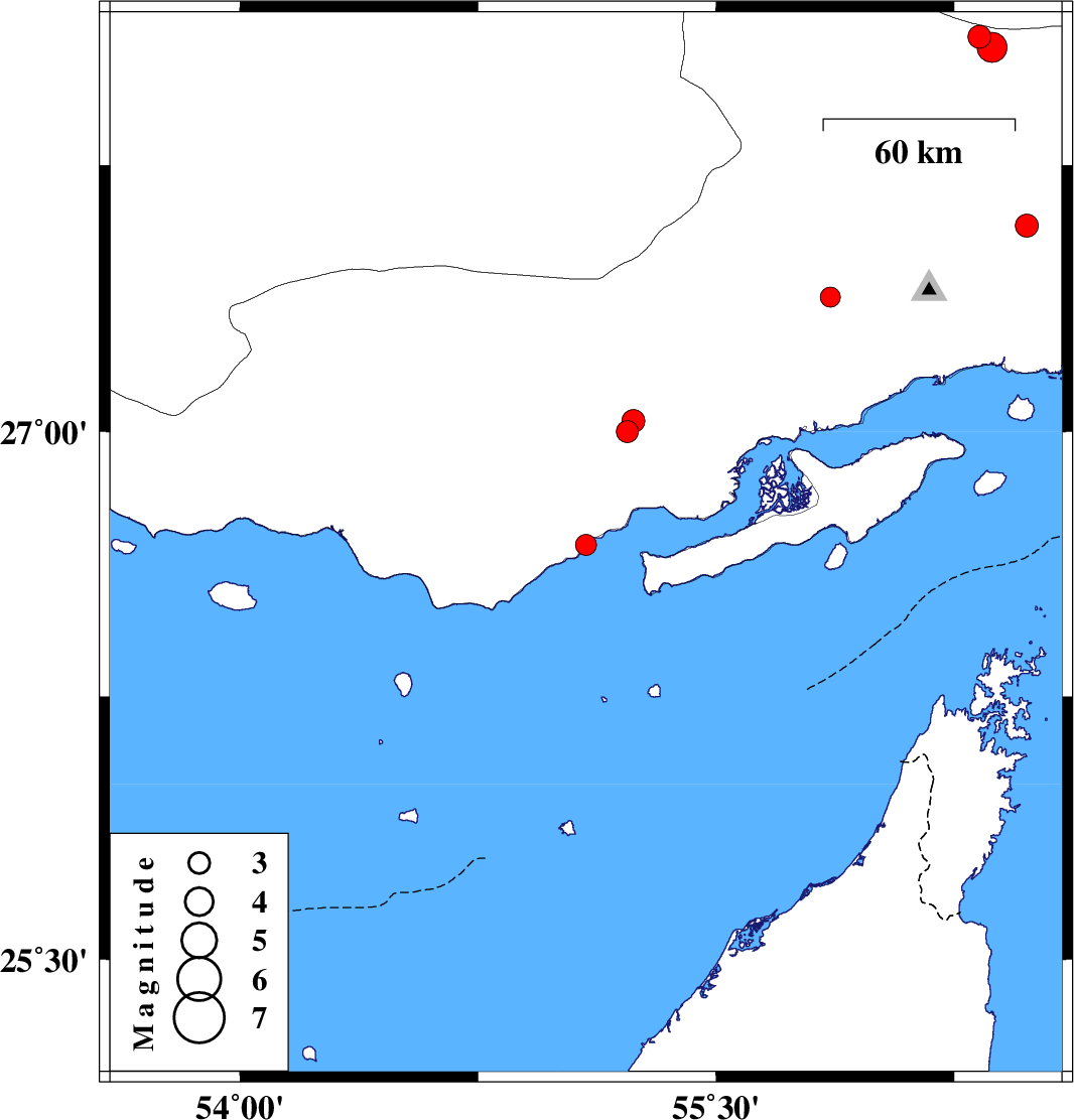 | 2008/06/23 | 22:16:14.6 | 02:46:14.6 | 27.58 | 56.48 | 14 | ML:3.3 | 48 km North-East of Bandar-e abbas, Hormozgan Province |
