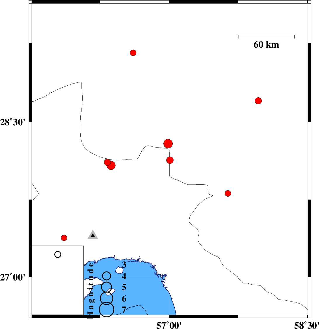 | 2008/06/24 | 02:01:25.7 | 06:31:25.7 | 27.81 | 57.64 | 16 | ML:3 | 16 km South of Kahnuj, Kerman Province |
