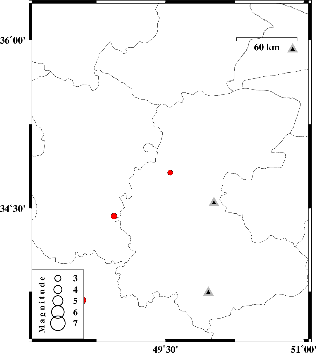2008/06/25 | 09:56:20.6 | 14:26:20.6 | 33.67 | 48.59 | 14 | ML:4.1 | 29 km South-West of Borujerd, Lorestan Province |
