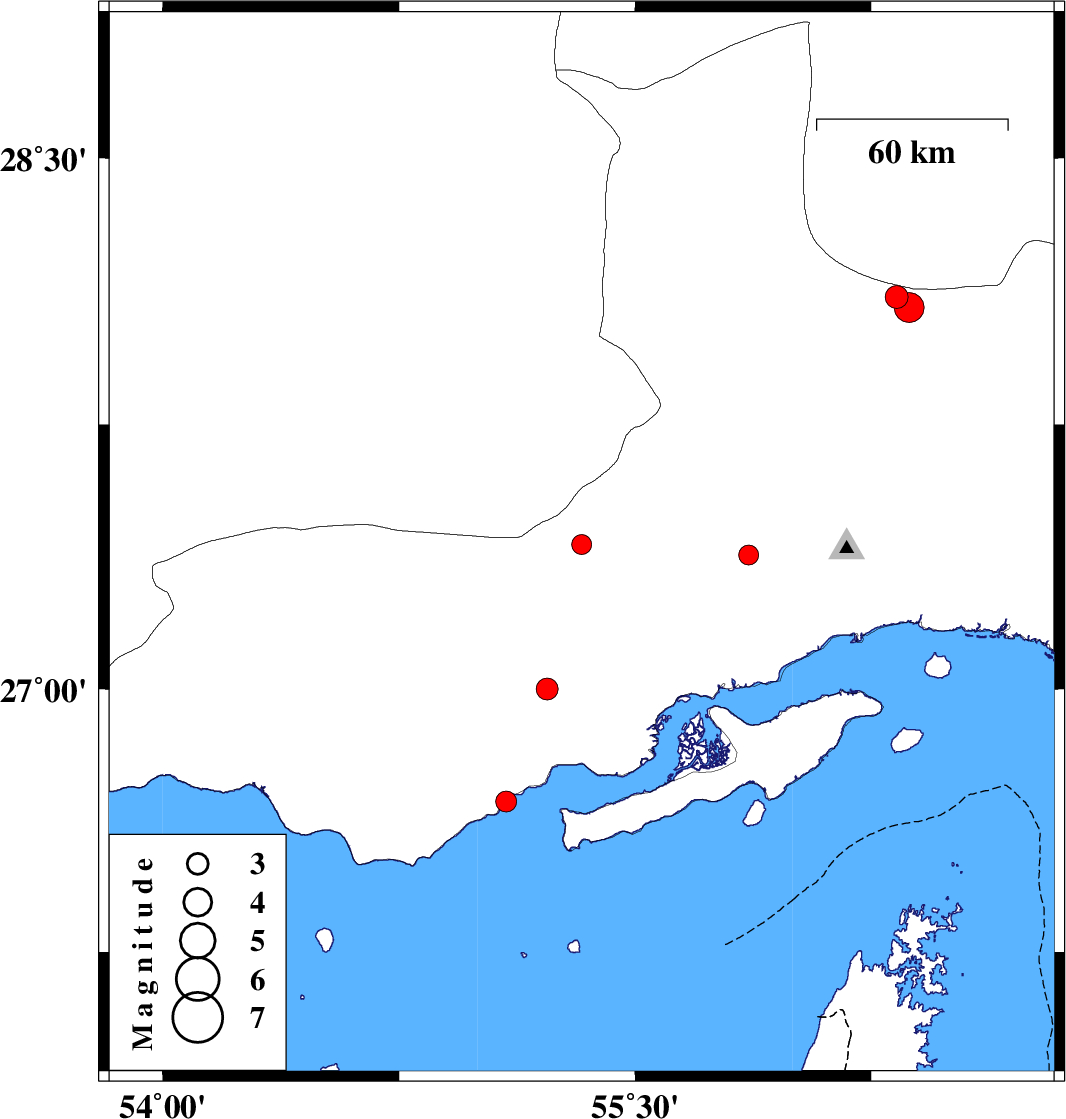 | 2008/06/28 | 01:43:29.2 | 06:13:29.2 | 27 | 55.22 | 14 | ML:3.1 | 63 km North-East of Bandar-e lengeh, Hormozgan Province |