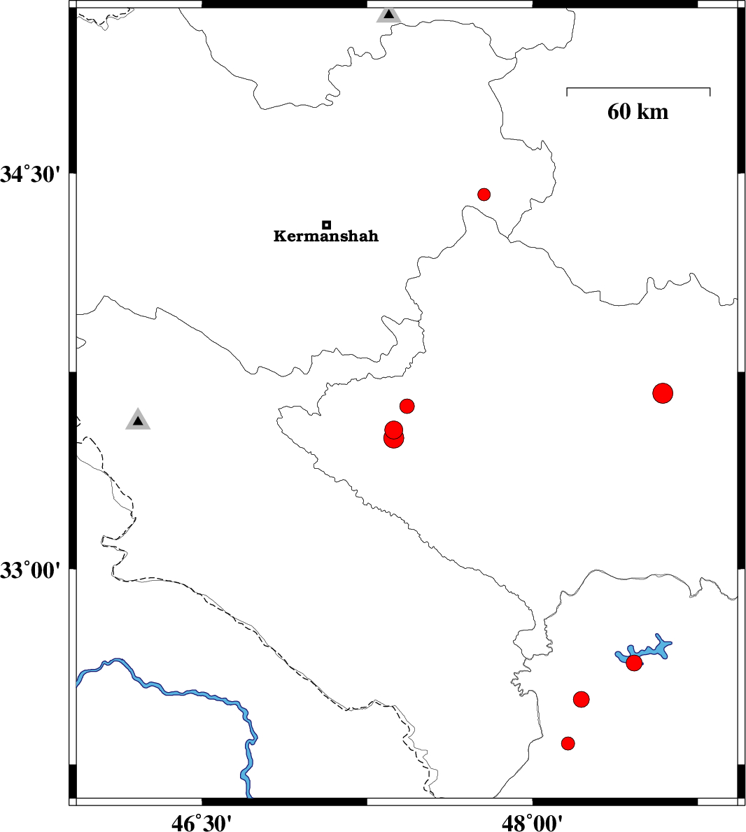 2008/07/13 | 04:24:26.8 | 08:54:26.8 | 33.62 | 47.43 | 16 | ML:2.9 | 19 km West of Kuhdasht, Lorestan Province | ||