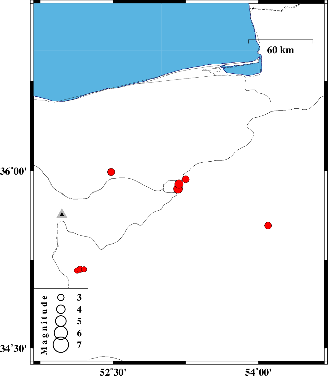 | 2008/06/19 | 02:29:07.7 | 06:59:07.7 | 35.16 | 52.13 | 32 | ML:2.7 | 20 km West of Garmsar, Semnan Province |