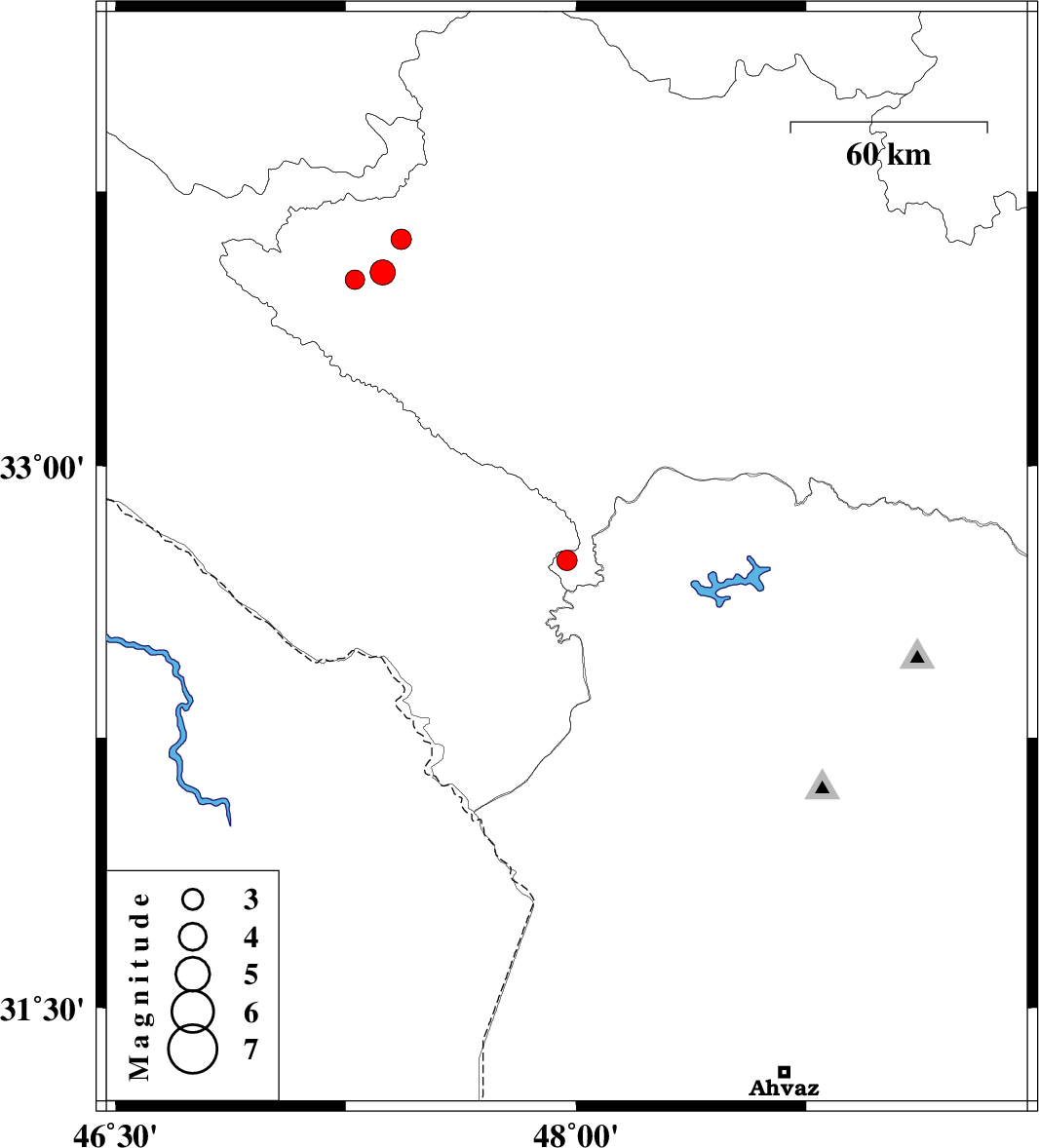 | 2008/07/20 | 02:20:19.8 | 06:50:19.8 | 32.74 | 47.97 | 46 | ML:2.9 | 47 km North-West of Andimeshk, Khoozestan Province | ||