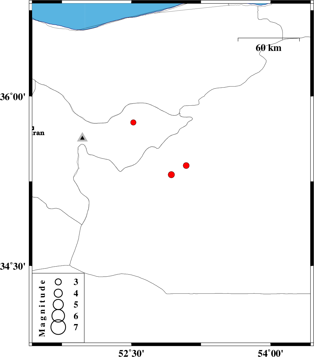 | 2008/07/24 | 00:37:41.3 | 05:07:41.3 | 35.31 | 52.93 | 14 | ML:3.1 | 51 km South-East of Firuzkuh, Tehran Province | ||