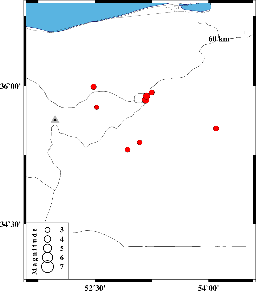 | 2008/06/24 | 14:46:22.2 | 19:16:22.2 | 35.93 | 53.25 | 14 | ML:3.2 | 26 km South-East of Pol-E-Sefid, Mazandaran Province |