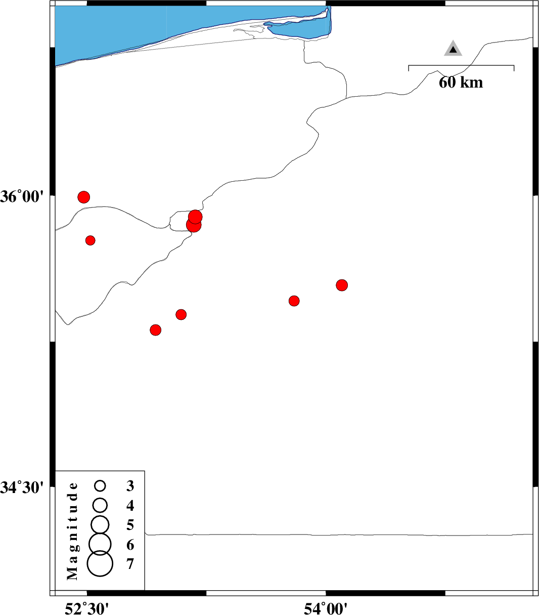 | 2008/06/29 | 00:38:27.1 | 05:08:27.1 | 35.99 | 52.48 | 14 | ML:3.4 | 37 km North-West of Firuzkuh, Tehran Province |
