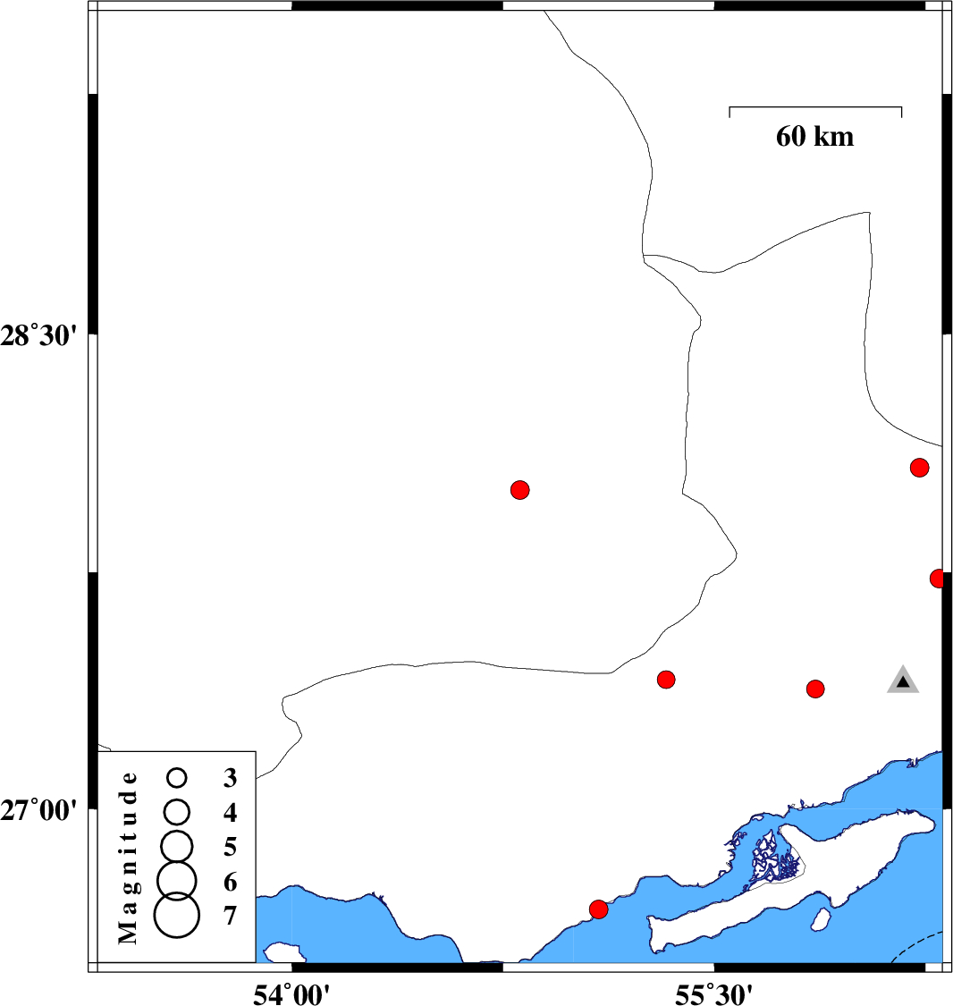 | 2008/06/30 | 03:41:00.8 | 08:11:00.8 | 26.68 | 55.09 | 35 | ML:3 | 28 km North-East of Bandar-e lengeh, Hormozgan Province |