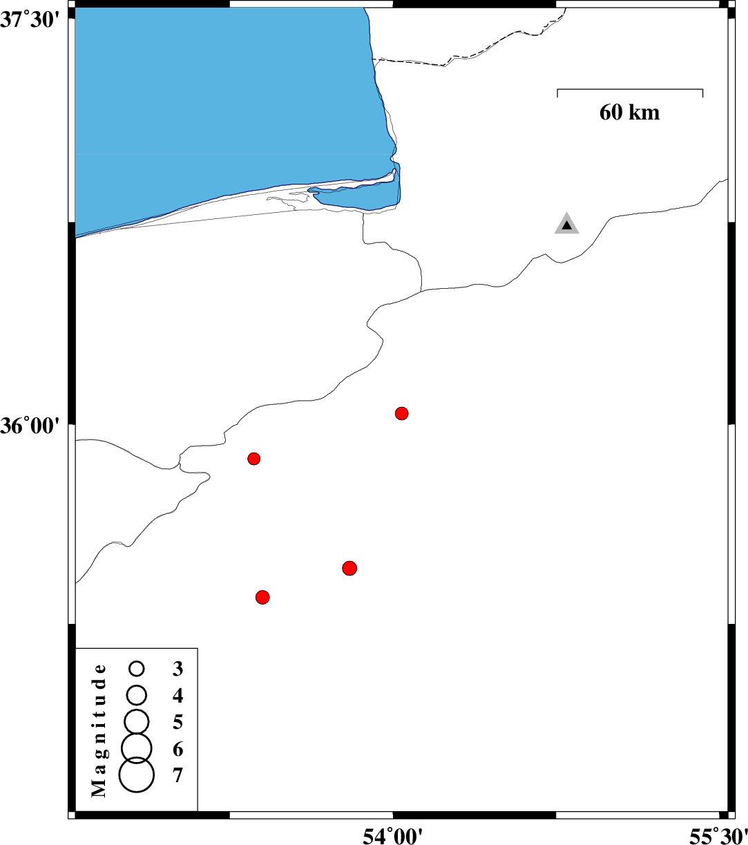 | 2008/08/01 | 02:07:55.8 | 06:37:55.8 | 36.04 | 54.04 | 42 | ML:2.7 | 31 km South-West of Damghan, Semnan Province | ||