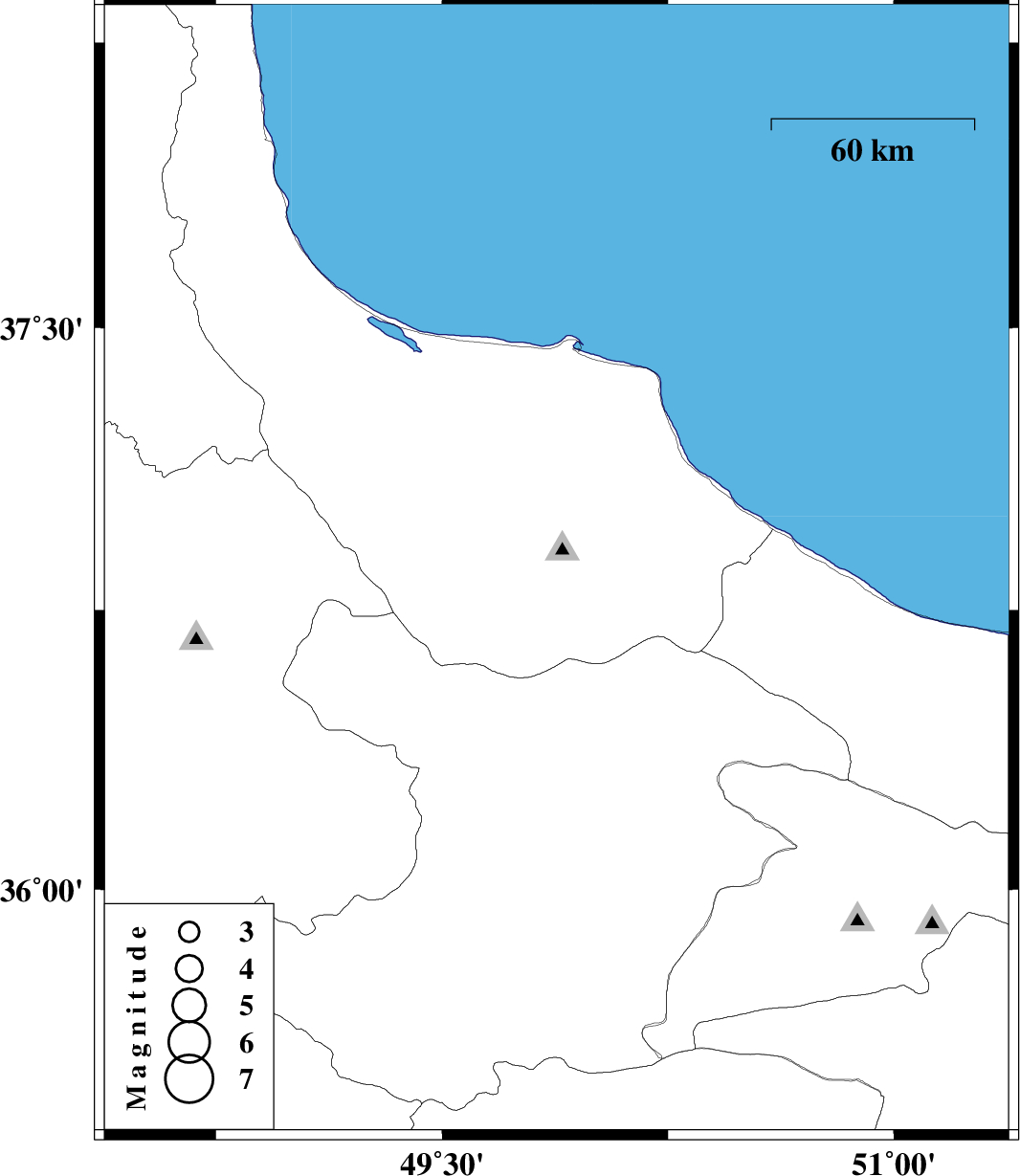 | 2008/08/02 | 17:17:24.0 | 21:47:24.0 | 36.85 | 49.88 | 14 | ML:2.6 | 33 km South of Siahkal, Gilan Province |