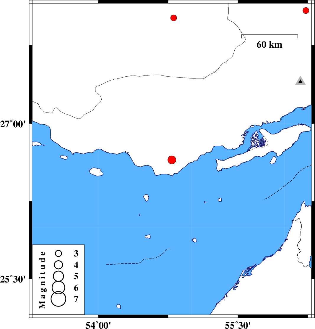| 2008/08/04 | 09:08:45.7 | 13:38:45.7 | 26.65 | 54.79 | 15 | ML:3.9 | 14 km North of Bandar-e lengeh, Hormozgan Province | ||