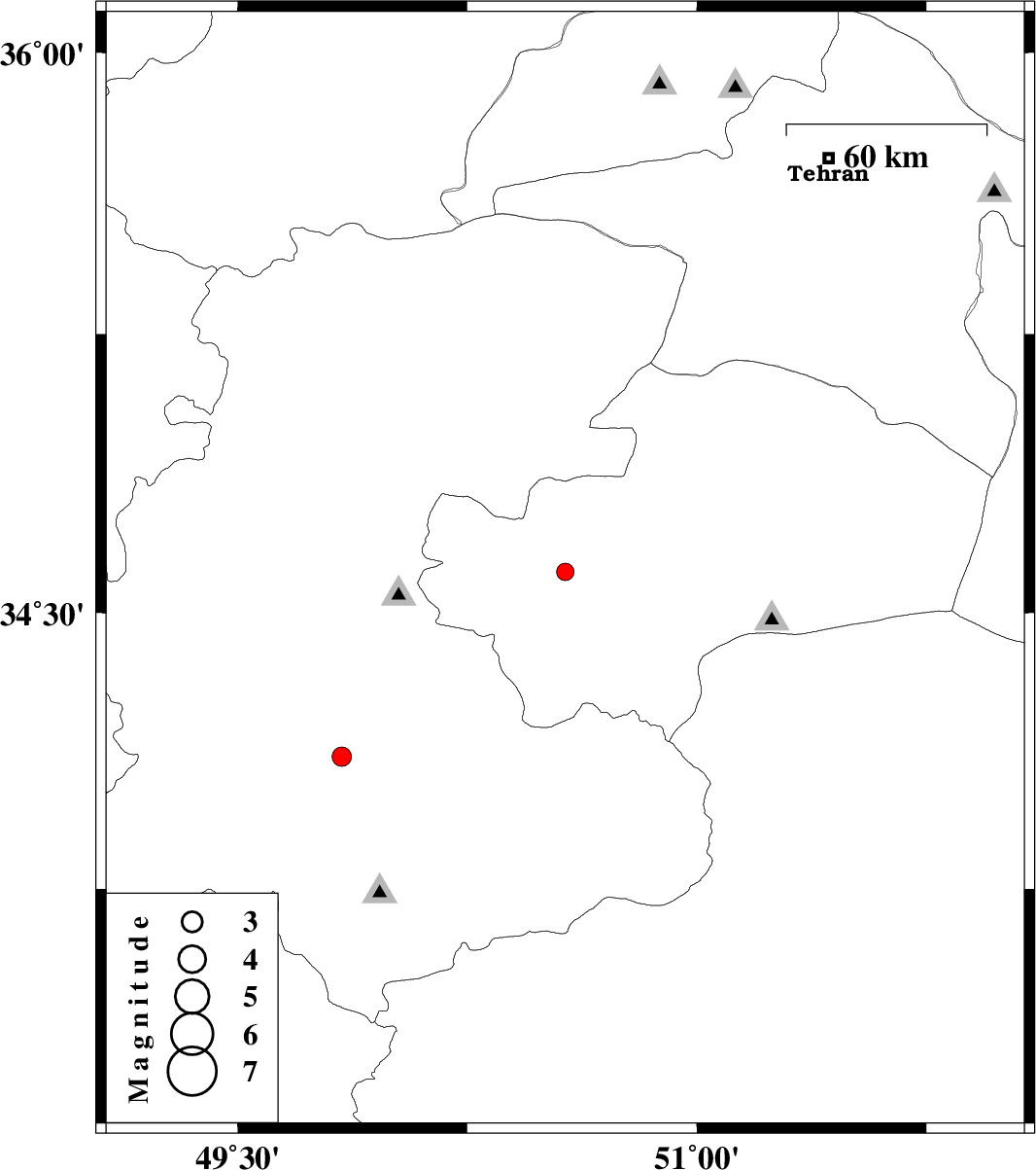 | 2008/07/18 | 04:37:19.4 | 09:07:19.4 | 34.11 | 49.84 | 14 | ML:2.8 | 14 km East of Arak, Markazi Province |