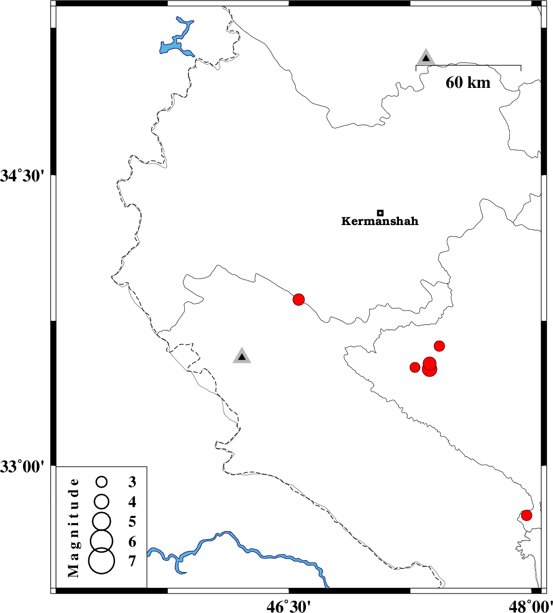 | 2008/07/12 | 22:19:20.2 | 02:49:20.2 | 33.5 | 47.37 | 14 | ML:4.1 | 23 km West of Kuhdasht, Lorestan Province |