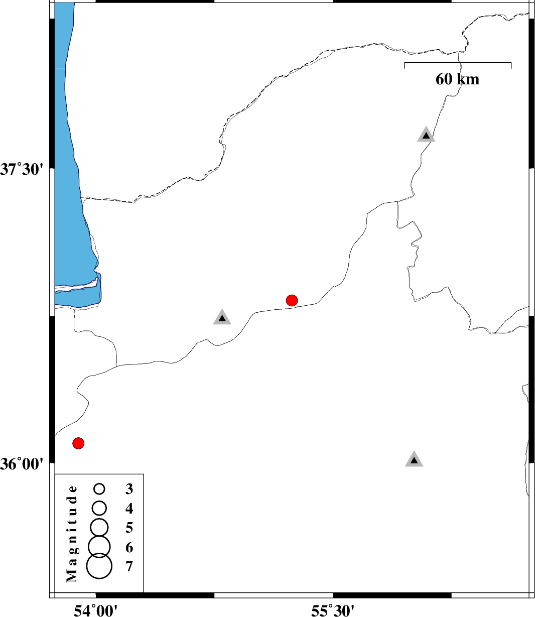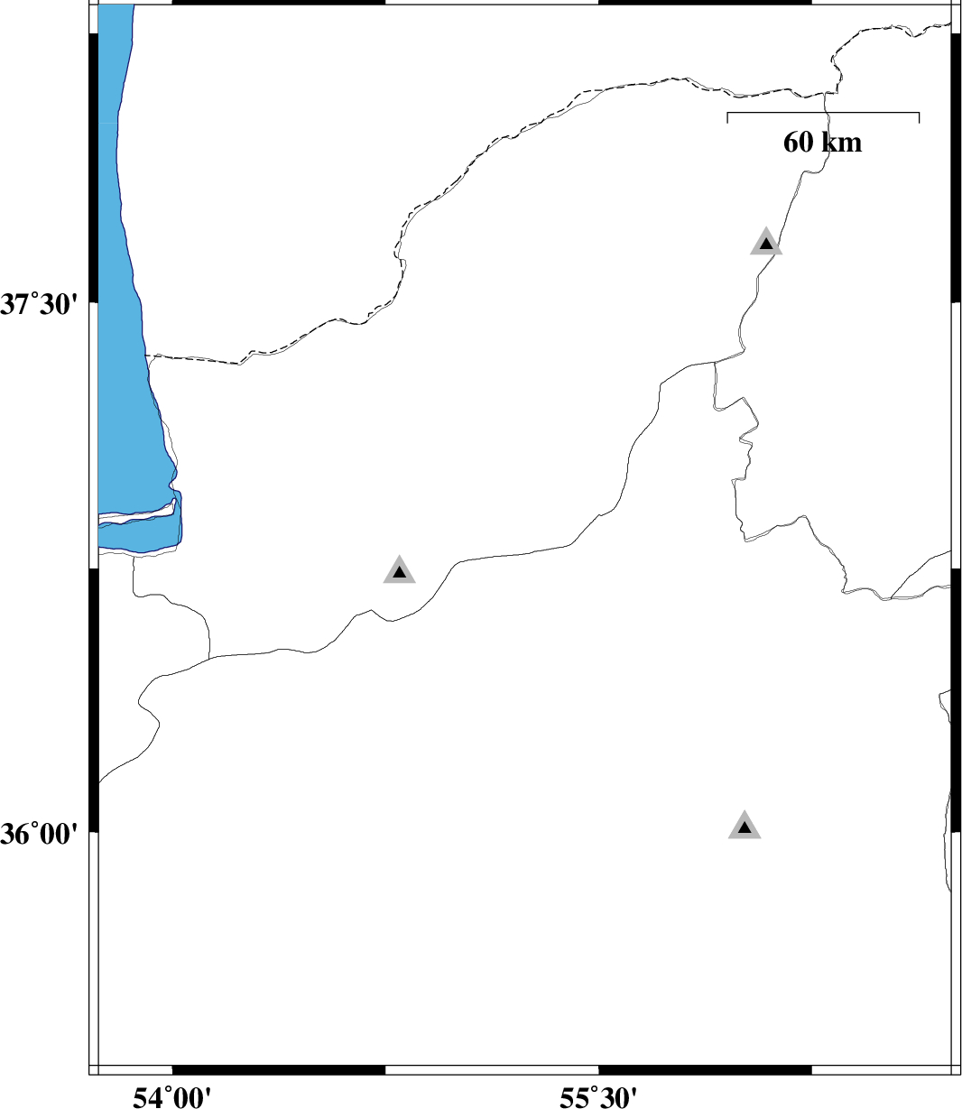 | 2008/08/10 | 00:29:49.6 | 04:59:49.6 | 36.83 | 55.24 | 15 | ML:3.3 | 21 km South of Ramian, Golestan Province | ||
