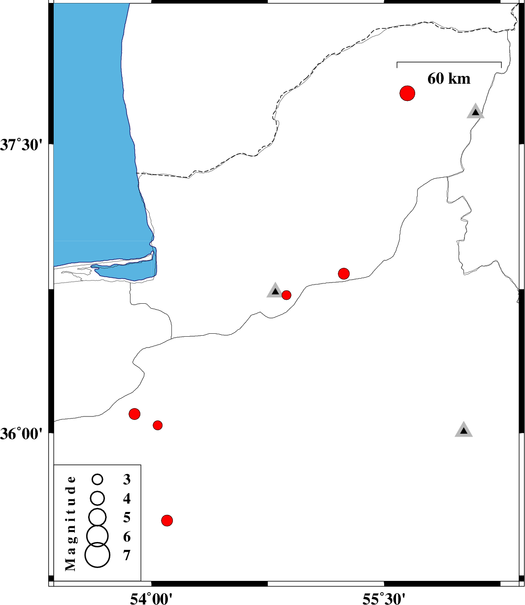 | 2008/08/10 | 00:29:49.6 | 04:59:49.6 | 36.83 | 55.24 | 15 | ML:3.3 | 21 km South of Ramian, Golestan Province | ||