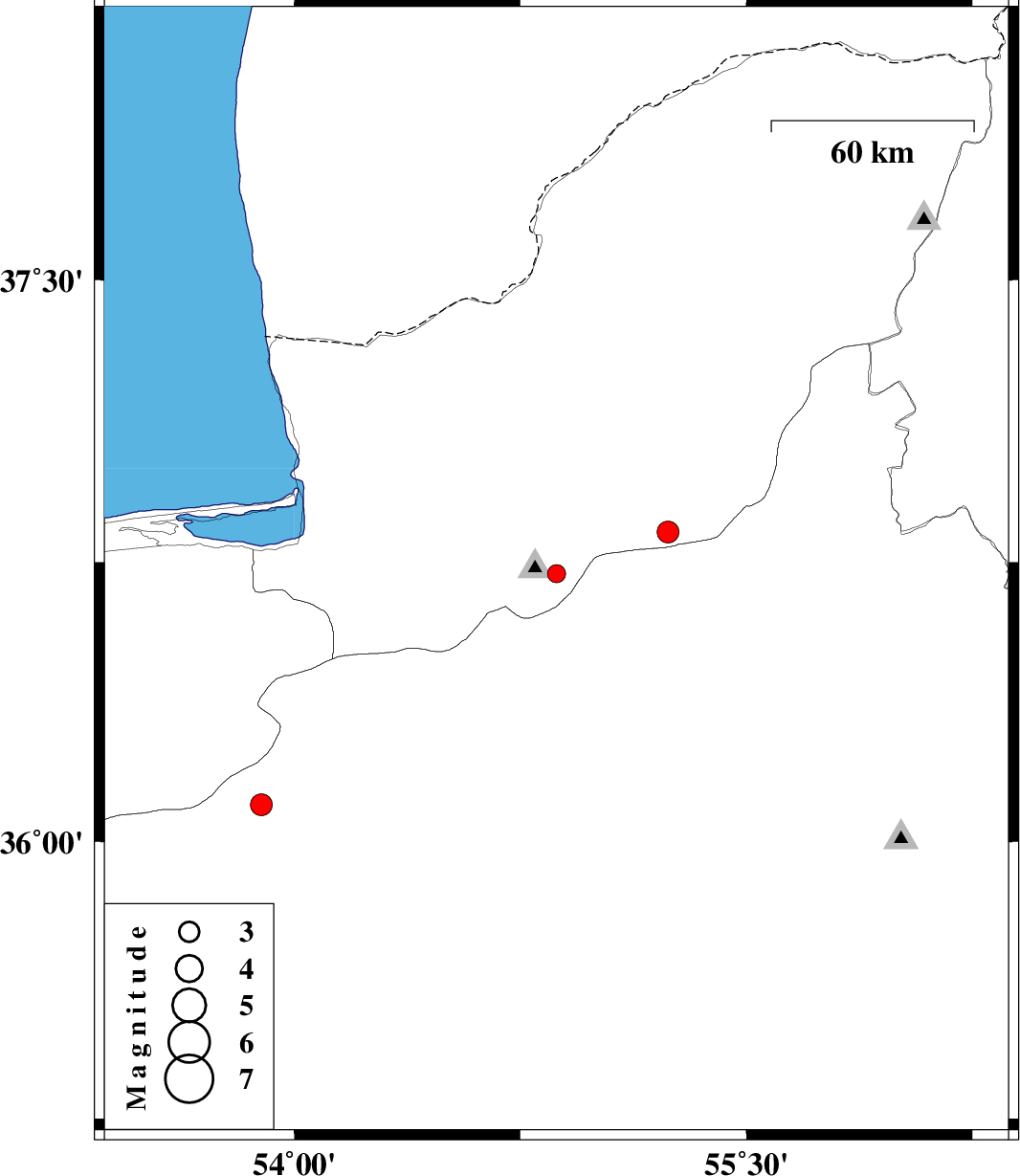 | 2008/08/10 | 00:29:49.6 | 04:59:49.6 | 36.83 | 55.24 | 15 | ML:3.3 | 21 km South of Ramian, Golestan Province | ||