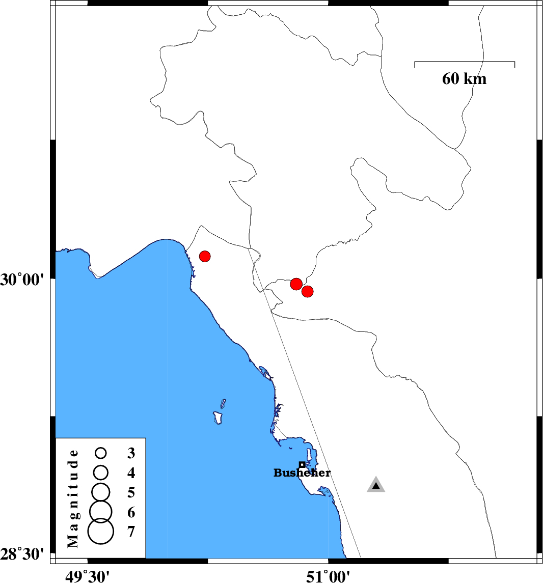 | 2008/08/07 | 21:41:39.1 | 02:11:39.1 | 30.12 | 50.23 | 15 | ML:3.1 | 51 km South-East of Hendijan, Khoozestan Province |