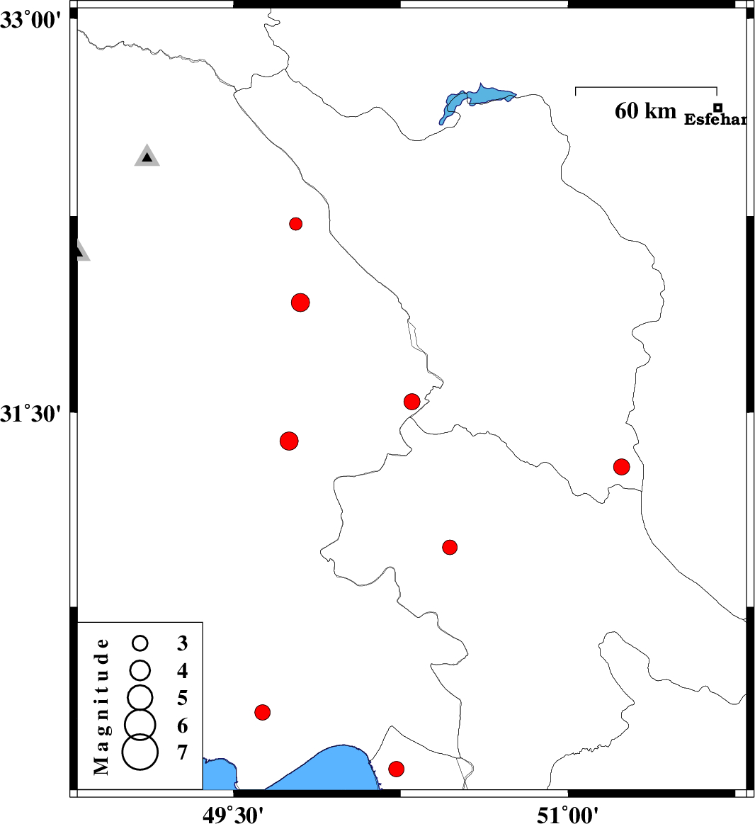 | 2008/08/13 | 00:15:29.4 | 04:45:29.4 | 31.29 | 51.24 | 14 | ML:3.3 | 34 km South-West of Semirom, Esfahan Province | ||